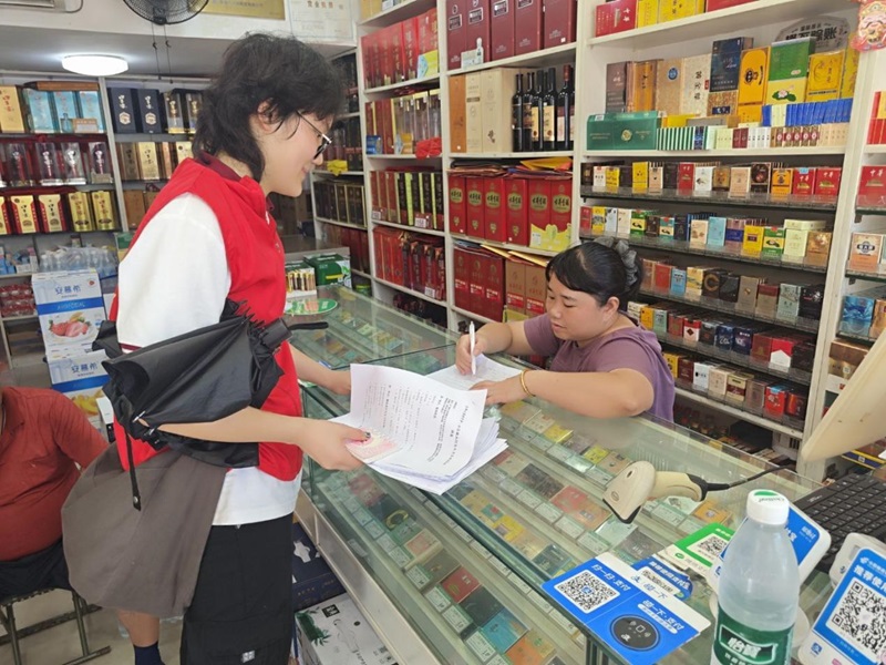 圖為花園社區(qū)內(nèi),隊員向臨街商戶發(fā)放宣傳材料,幫助商戶區(qū)分正規(guī)獻血渠道與違規(guī)采血行為。阮夢婷 供圖