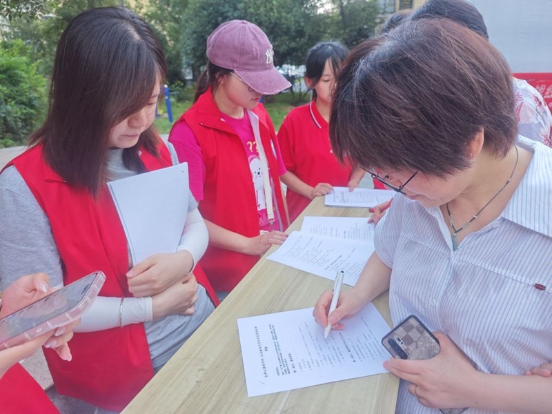 圖為團隊成員在臥牛山街道北大街社區(qū)向過往居民發(fā)放獻血知識問卷,以收集居民對無償獻血的認(rèn)知情況。張翔宇 供圖
