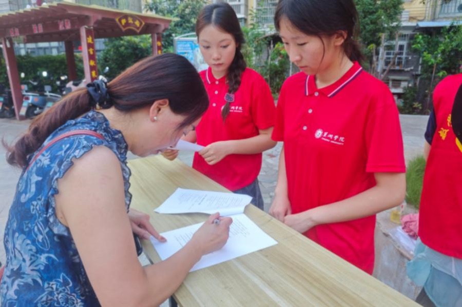 圖為巢湖學(xué)院"獻(xiàn)血賦能·健康調(diào)研”宣傳團(tuán)成員在巢湖市臥牛山街道北大街社區(qū)為居民發(fā)放調(diào)查問卷。曾悅 供圖