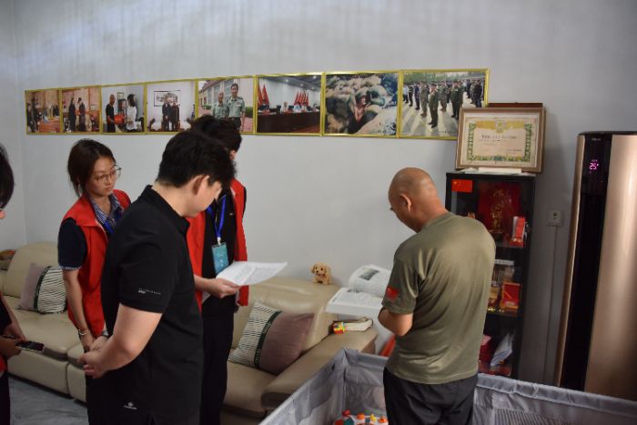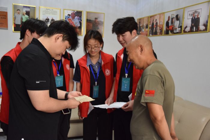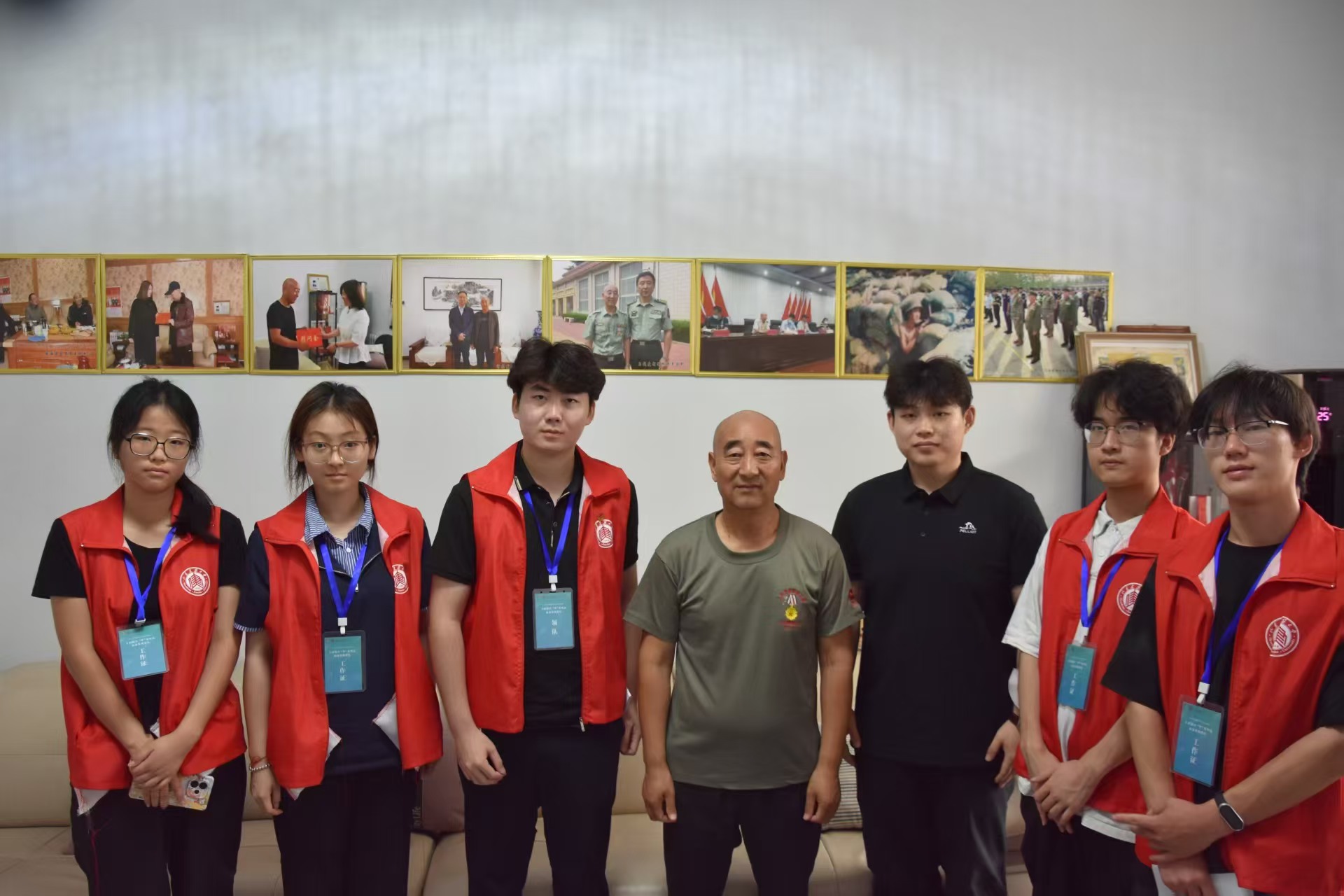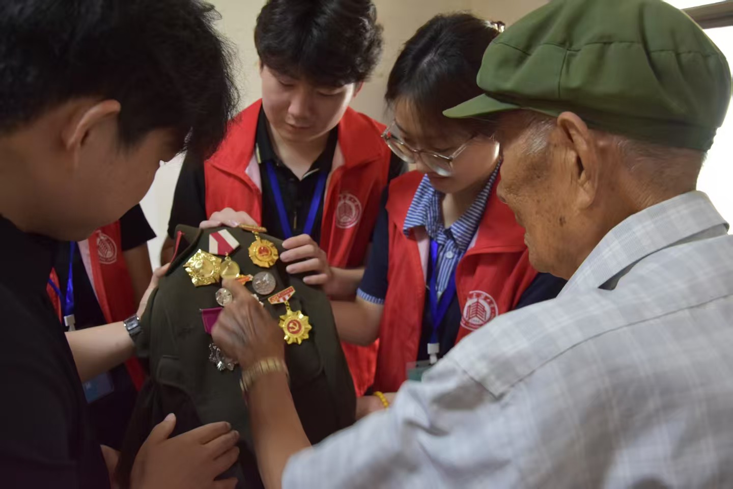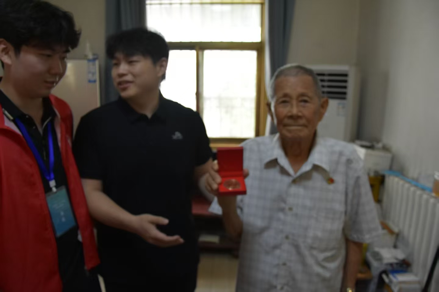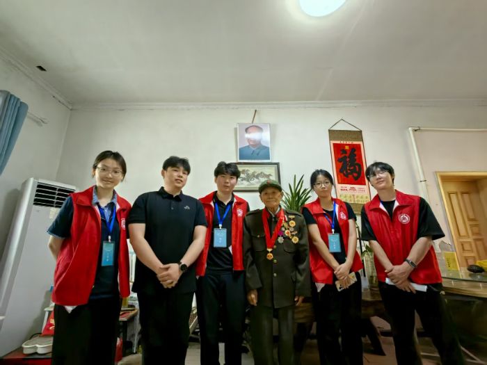 當(dāng)武老談及到當(dāng)年參戰(zhàn)時(shí)的經(jīng)歷時(shí),他神情激動(dòng),仿佛又回到了那個(gè)槍林彈雨的戰(zhàn)場。武老為團(tuán)隊(duì)成員細(xì)細(xì)述說了他參軍時(shí)的所見所聞,生動(dòng)描繪了那段波瀾壯闊的艱苦歲月,讓所有實(shí)踐團(tuán)隊(duì)成員為之動(dòng)容。隨后武老示意他的女兒拿出他的軍服,看到武老掛滿勛章的軍服后,團(tuán)隊(duì)成員雙眼一亮,被這身帥氣的衣服所折服,紛紛上前以便更清晰地欣賞這身軍裝。隨后武老換上掛滿勛章的軍服后,為團(tuán)隊(duì)成員逐一介紹了每枚勛章的由來。緊接著在團(tuán)隊(duì)顧問劉志浩的提議下,武老帶領(lǐng)團(tuán)隊(duì)成員中的黨員一起重溫入黨誓詞。當(dāng)“我志愿加入中國共產(chǎn)黨”的誓言從大家口中鏗鏘道出時(shí),武老眼中泛起的淚光與年輕黨員們堅(jiān)毅的眼神在空氣中交匯。每一個(gè)字都像帶著千鈞之力,撞在斑駁的墻壁上又反彈回來,在不大的房間里久久回蕩。這聲音里,有武老幾十載黨齡沉淀的赤誠,也有青年黨員們初入組織的熱血,一句句誓言串聯(lián)起跨越時(shí)代的信仰,讓紅色精神在新老交替的凝視中完成了一次無聲卻厚重的傳承。