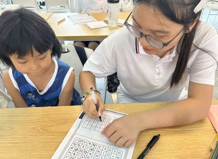 圖為實(shí)踐團(tuán)成員制作舒爾特方格間  楊揚(yáng)攝