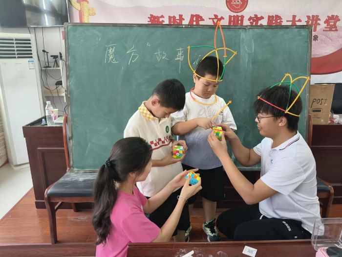 圖為實(shí)踐團(tuán)成員帶領(lǐng)孩子們拼魔方并分享故事  臺(tái)可娜攝