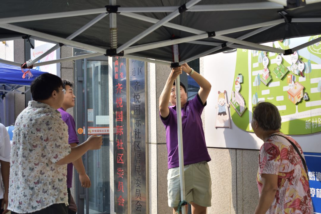 實(shí)踐團(tuán)成員抵達(dá)“黃河大集”現(xiàn)場(chǎng),與社區(qū)工作人員對(duì)接當(dāng)日任務(wù)。為確保集市在開(kāi)市前完成各項(xiàng)準(zhǔn)備工作,成員們迅速分工,按照預(yù)設(shè)方案投入布置工作。