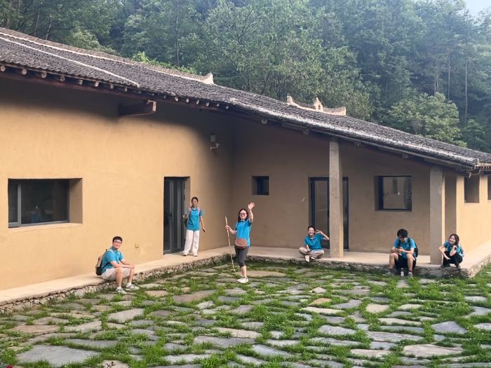 實(shí)踐隊(duì)通過實(shí)地測(cè)繪、深度訪談與空間體驗(yàn)相結(jié)合的方式,系統(tǒng)考察了該民宿集群的建筑改造理念及其所蘊(yùn)含的建筑技藝。該建筑群坐落于秦嶺半山腰處,是由廢棄的陜南傳統(tǒng)夯土民居建筑改造而成,現(xiàn)已為較為成功的高端生態(tài)旅居空間,該建筑群的改造成功為鄉(xiāng)村建設(shè)方案提供了重要參考。
