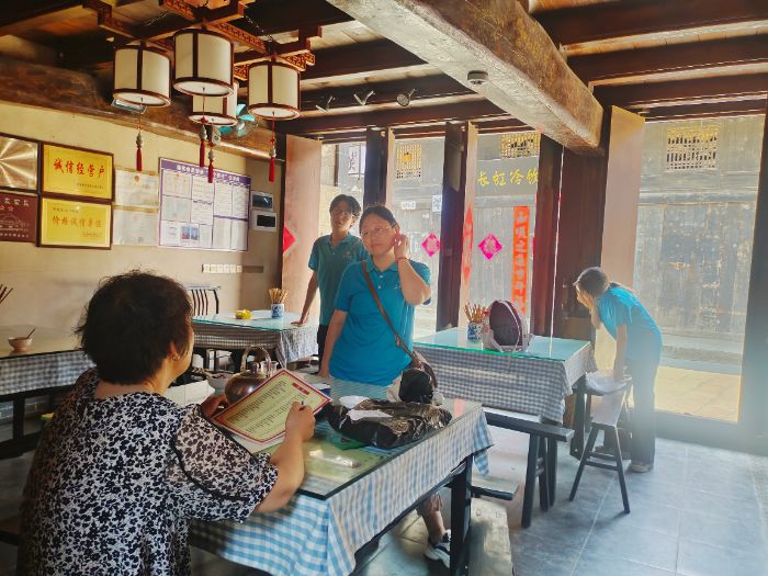 實踐隊走進了擁有著百年歷史的長盛祥農(nóng)家樂,其講述了湖北的木作營造技術與明代康茂財后代康永盛第三次新建鳳凰街的歷史功績。