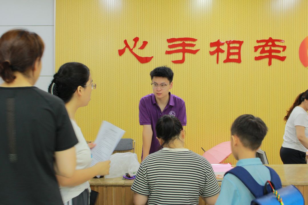 成員們來到社區(qū)后,已經(jīng)有不少想要了解“齊小團(tuán)”暑期課堂的家長在服務(wù)中心等待,進(jìn)行“齊小團(tuán)”第二期的報名工作。此時社區(qū)工作人員也已忙得不可開交。工作人員們看到實踐團(tuán)成員們的到來,首先對大家進(jìn)行了鼓勵,然后根據(jù)現(xiàn)場情況給成員們安排了工作——幫助指導(dǎo)“齊小團(tuán)”暑期課堂學(xué)生家長填寫報名表。成員們根據(jù)任務(wù)流程,將工作分為接待、填寫、電腦錄入等環(huán)節(jié),成員們各司其職,保證井然有序的同時更好地完成工作,做到高效率、人滿意。