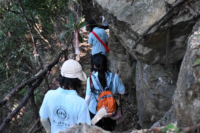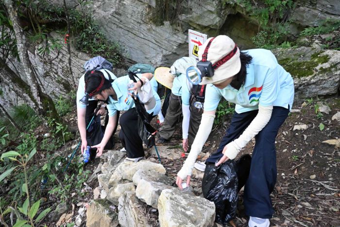 穿越溶洞,實(shí)踐團(tuán)沿著甘香峽谷溪流繼續(xù)前行。隊(duì)員們還與沿途游客進(jìn)行交流,收集他們對徒步路線的體驗(yàn)反饋與改進(jìn)建議。徒步期間,團(tuán)隊(duì)成員們發(fā)現(xiàn)步道周邊存在白色垃圾,自發(fā)取出隨身攜帶的垃圾袋,拾起掉落在山間溪邊的塑料瓶、食品包裝袋,將“潔小青”的理念落到實(shí)處。