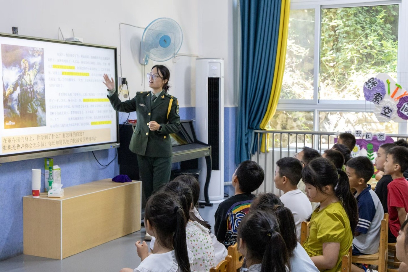 一身戎裝映初心,英雄故事勵(lì)童心。課程由中國(guó)石油大學(xué)(華東)國(guó)旗護(hù)衛(wèi)隊(duì)成員孫雅琦老師主講,她身著筆挺的國(guó)旗護(hù)衛(wèi)隊(duì)隊(duì)服,一亮相便吸引了同學(xué)們的目光。孫老師先是分享了自己加入國(guó)旗護(hù)衛(wèi)隊(duì)的經(jīng)歷,從訓(xùn)練的艱辛到護(hù)衛(wèi)天安門“2023-0270”國(guó)旗的榮耀,點(diǎn)點(diǎn)滴滴都激發(fā)著同學(xué)們的好奇心與崇敬感。隨后,她娓娓道來(lái)狼牙山五壯士“寧為玉碎,不為瓦全”的臨危壯舉,講述董存瑞舍身炸碉堡時(shí)“為了勝利,向我開(kāi)炮”的決絕擔(dān)當(dāng)。一個(gè)個(gè)鮮活的英雄故事,如春雨般滋潤(rùn)著孩子們的心田,讓愛(ài)國(guó)的種子在潛移默化中生根發(fā)芽。