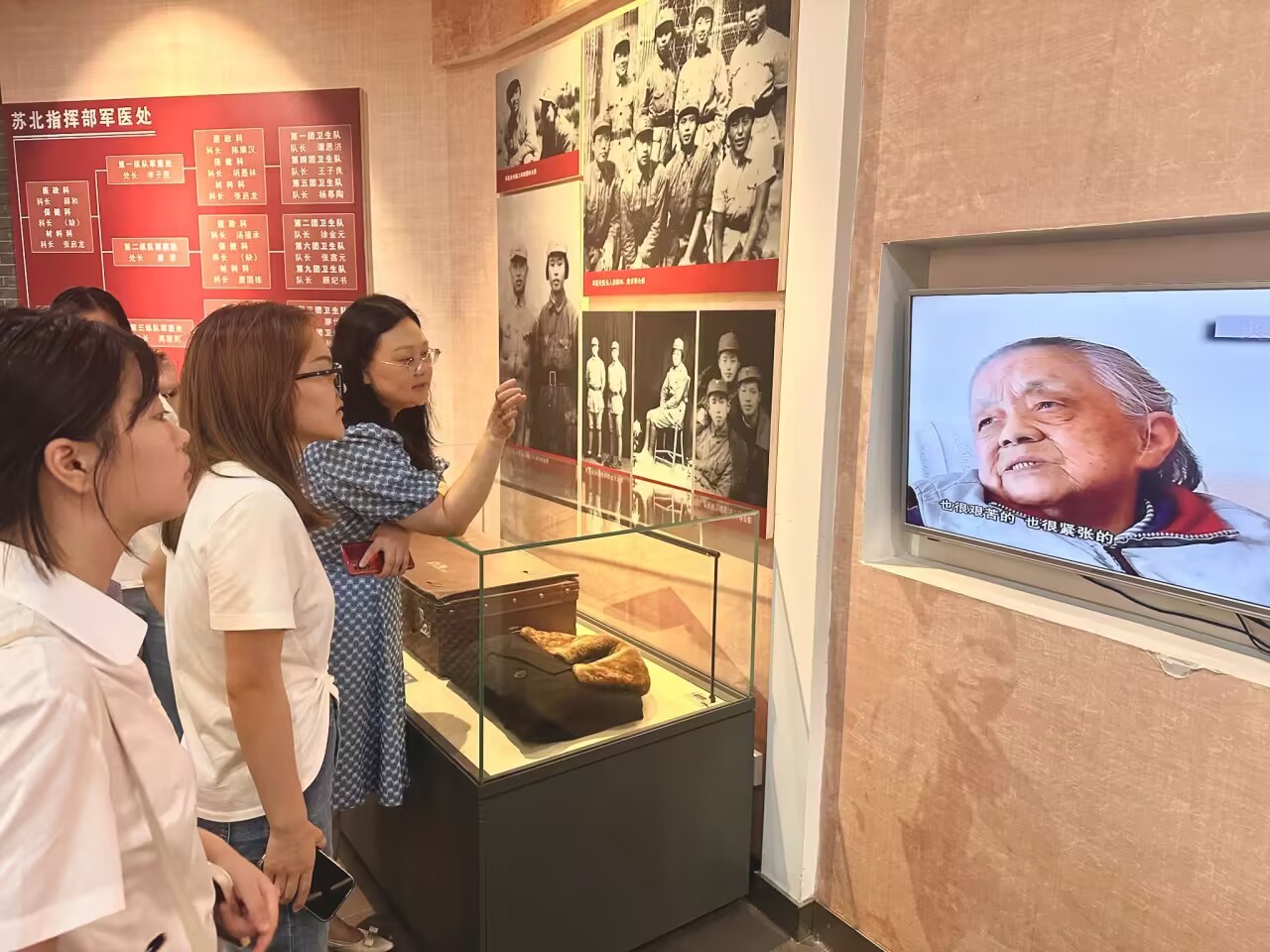 7月27日清晨,南京財經(jīng)大學三下鄉(xiāng)團隊懷著崇敬的心情來到新四軍黃橋戰(zhàn)役紀念館。館內(nèi)的每一件文物都承載著一段崢嶸歲月,從銹跡斑斑的步槍到泛黃的作戰(zhàn)地圖,從戰(zhàn)士們穿過的補丁軍裝到百姓支援前線的扁擔,無不訴說著當年的浴血奮戰(zhàn)。團隊成員們認真聆聽講解員的介紹,不時在筆記本上記錄關(guān)鍵信息。在“軍民魚水情”展區(qū),當聽到當?shù)匕傩者B夜趕制燒餅支援前線的故事時,不少同學眼眶濕潤。團隊成員潘穎表示:“課本上的歷史在這里變得鮮活可觸,革命先烈的犧牲精神讓我深受震撼。”
