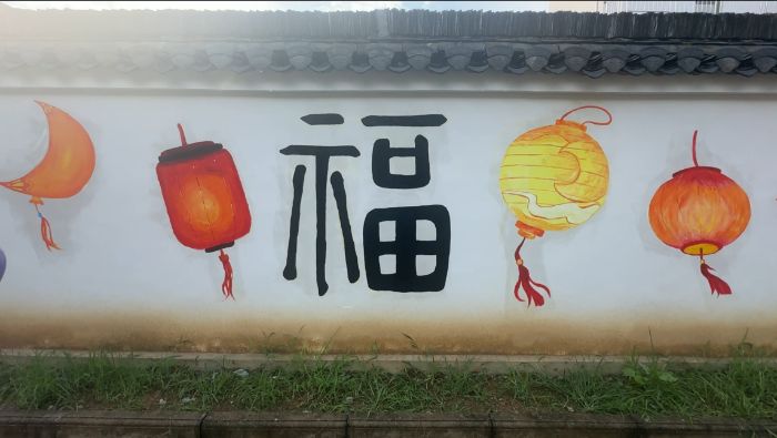實踐過程中,全體成員秉持高度的責任感與使命感,將中華優(yōu)秀傳統(tǒng)文化元素與現(xiàn)代創(chuàng)意設計理念深度融合。在墻體繪制過程中,團隊精心勾勒極具傳統(tǒng)韻味的“福”字,巧妙搭配靈動鮮活的燈籠、清雅高潔的蓮花等圖案。其中,“福”字承載著對村民幸福安康、吉祥如意的深切祝福;燈籠造型寓意著鄉(xiāng)村產(chǎn)業(yè)發(fā)展蒸蒸日上、村民生活紅紅火火;蓮花則象征著清正廉潔的文化風尚與純潔美好的精神追求。這些富含深意的藝術符號,讓原本質(zhì)樸的鄉(xiāng)村墻面煥發(fā)全新生機,成為傳播傳統(tǒng)文化與時代精神的鮮活載體。
