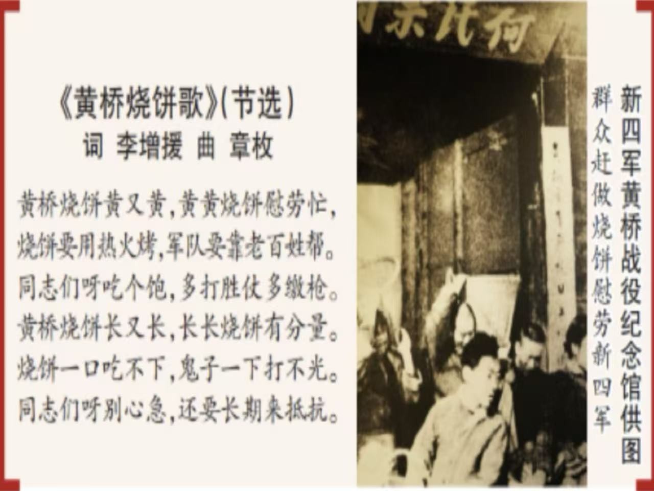 “燒餅傳遞的不僅是食物,更是民心。”團(tuán)隊(duì)成員感慨道。戰(zhàn)役期間,黃橋鎮(zhèn)呈現(xiàn)“家家無閑人,戶戶做燒餅”的壯景:老人揉面、婦女燒水、兒童撿柴,青壯年穿越火線送餅。一首黃橋燒餅歌由此誕生:“黃橋燒餅黃又黃,黃黃的燒餅慰勞忙,燒餅要用熱火烤,軍隊(duì)要考老百姓幫。同志們呀吃得飽,多打勝仗多繳槍”,歌詞道出了軍民魚水情的真諦。新四軍戰(zhàn)士捧著百姓手制的燒餅,士氣大振,最終以少勝多,奠定了蘇北抗日根據(jù)地的基礎(chǔ)。