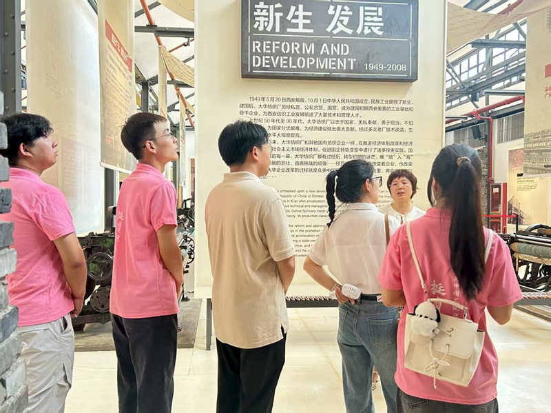 西安大華 1935 博物館依托長安大華紡織廠老舊廠房改造而成,通過史料文獻、實物展陳、歷史圖片、場景復原及多媒體互動等多元形式,全景展現(xiàn)了長安大華紡織廠從 “興建創(chuàng)業(yè)” 到 “新生發(fā)展” 再到 “鳳凰涅槃” 的百年歷程。跟隨講解員的腳步,師生們逐一參觀展廳,認真聆聽這段跨越世紀的工業(yè)史詩:從 1935 年建廠時的艱辛拓荒,到抗戰(zhàn)時期支援前線的熱血擔當;從新中國成立后領(lǐng)跑西北工業(yè)的飛速崛起,到面對時代浪潮主動轉(zhuǎn)型的勇毅探索。銹跡斑斑的老機床、泛黃的生產(chǎn)報表、磨損的工作證…… 每一件老物件、每一張舊照片都在無聲訴說著波瀾壯闊的歲月,讓在場師生深切體會到民族工業(yè)的堅韌底色與先輩們的奮斗精神