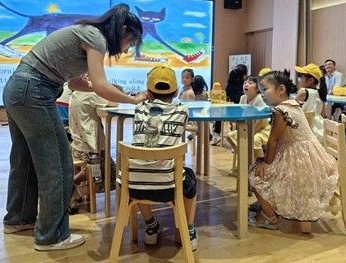 活動現(xiàn)場,主講志愿者通過生動的肢體語言和豐富的表情,帶領(lǐng)孩子們走進(jìn)Pete the Cat的奇妙世界。當(dāng)講到Pete的白鞋子變成紅色時,志愿者拿出準(zhǔn)備好的道具鞋子進(jìn)行演示,引發(fā)孩子們陣陣笑聲。