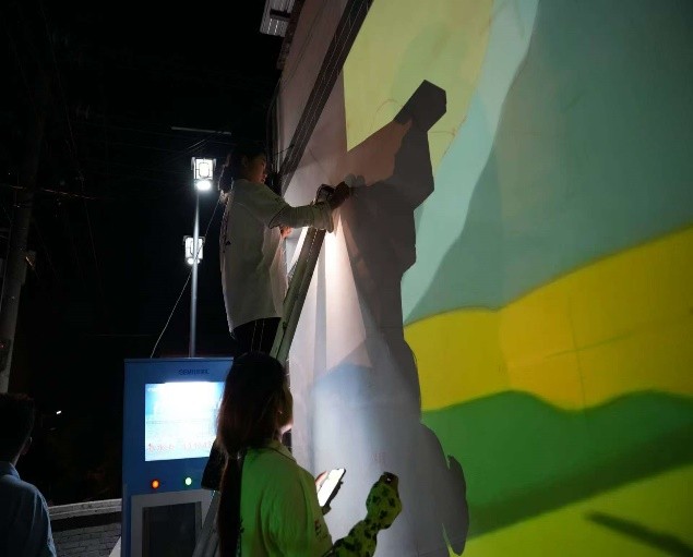 坐落在周一村最核心的位置,這幅全村最大的墻面繪畫,無疑是周一村最吸睛的存在。該墻繪的繪制過程充滿艱辛與挑戰(zhàn)。由于墻面較高,成員們需要搭建梯子進(jìn)行作業(yè),這增加了工作的難度,但他們沒有絲毫退縮。在40度的高溫天氣下,為趕工期、如期完成任務(wù),實踐團(tuán)成員們決意連夜投入繪制工作。在繪制過程中,他們多次進(jìn)行整體和局部效果的對比,精心調(diào)整每一處細(xì)節(jié),以保證畫面的完整性和整體性。