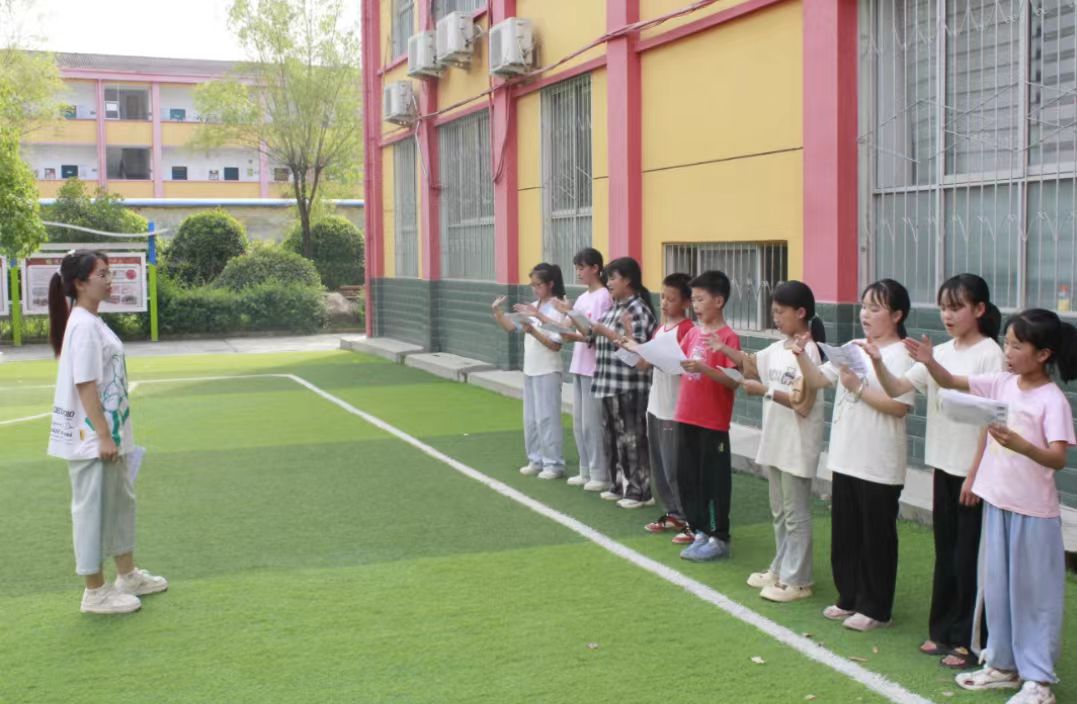 方音為根 普語(yǔ)為翼在三門村小學(xué),實(shí)踐團(tuán)以“講普通話 寫規(guī)范字”為起點(diǎn),將拼音教學(xué)轉(zhuǎn)化為開啟文化之門的鑰匙。成員們帶領(lǐng)孩子們從《三字經(jīng)》的啟蒙誦讀到《我和我的祖國(guó)》的深情詠唱,用標(biāo)準(zhǔn)普通話串聯(lián)中華文脈。此外,實(shí)踐團(tuán)運(yùn)用“柔性推普”策略,通過(guò)繞口令擂臺(tái)賽、方言與普通話“互譯游戲”、情景劇排練等趣味活動(dòng),讓孩子們?cè)跉g笑中自然接納普通話。一位扎著小辮的女孩在課間坦言:“雖然和同學(xué)玩說(shuō)方言更順口,但老師的普通話也很好聽,我們都想學(xué)普通話。”推廣普通話,并非要替代鄉(xiāng)音,而是讓孩子們?cè)谑刈o(hù)方言根脈的同時(shí),也能自信運(yùn)用普通話連接更廣闊的世界。