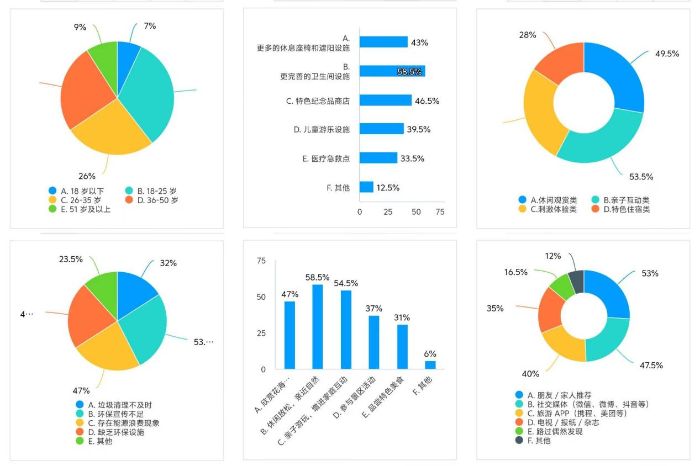 統(tǒng)計(jì)分析顯示:從需求來看,58.5%的游客期待“更完善的衛(wèi)生間設(shè)施”,43%希望增設(shè)“休息座椅和遮陽設(shè)施”,反映出景區(qū)基礎(chǔ)服務(wù)仍有優(yōu)化空間;從環(huán)保問題而言,“垃圾清理不及時(shí)”“環(huán)保宣傳不足”占比居前,提示需加強(qiáng)生態(tài)管理;從信息來源看,53%的游客通過“社交媒體”了解景區(qū),印證了“網(wǎng)紅打卡點(diǎn)優(yōu)化”的必要性。