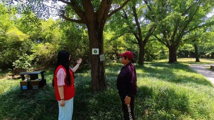 “為了您,這座古銀杏群已等了千年。”實(shí)踐團(tuán)成員們懷揣著對(duì)自然的敬畏之心踏入泰興古銀杏公園,開(kāi)展生態(tài)辨識(shí)研學(xué)活動(dòng)。1.1萬(wàn)株百年銀杏與兩株千年古樹(shù)傲然挺立,虬枝舒展間,見(jiàn)證著歲月的更迭。團(tuán)隊(duì)成員們穿梭于銀杏林深處,利用數(shù)字軟件“花伴侶”開(kāi)展生態(tài)辨識(shí)。同時(shí),團(tuán)隊(duì)成員邀請(qǐng)游客們一同參與生態(tài)探索,俯身細(xì)察扇形葉片的精致脈絡(luò),認(rèn)真記錄數(shù)據(jù),探尋“植物活化石”歷經(jīng)時(shí)代更迭而不朽的生存智慧。從銀杏的葉片到林間其他花草的生長(zhǎng)特性,每一次辨識(shí)都是與自然的一次深度對(duì)話,讓保護(hù)自然的種子在每個(gè)人心中悄然生根,為古銀杏公園增添了一抹溫暖的人文綠意。