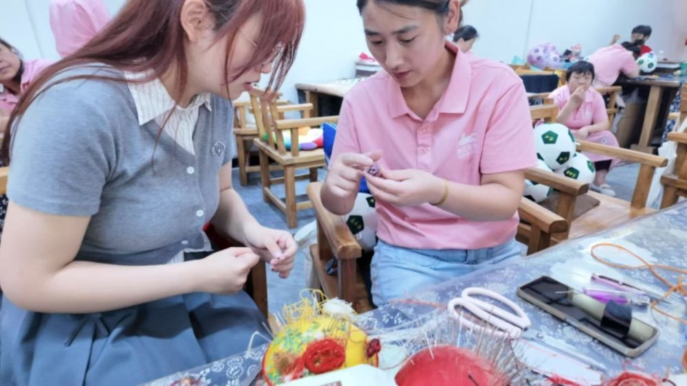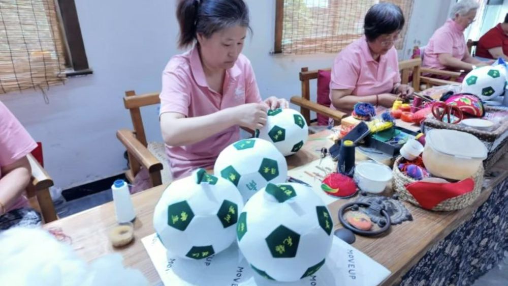 足球上的針線:非遺技藝的“跨界”創(chuàng)新 在香包工坊里的另一處內(nèi)幾位師傅正圍坐在一起,手中縫制的不是綢緞香囊,而是黑白相間的足球。這是馬莊工坊開發(fā)的“蘇超”足球香包項目。從香包的“小而美”到足球的“大而實”,不變的是對“針腳牢固、形態(tài)周正”的追求。王秀英老人表示:“手藝不能只躺在過去里,得跟著時代走。”如今,香包不僅有了車載掛件、文創(chuàng)禮盒等新形態(tài),針線活又走進了足球制作,傳統(tǒng)技藝正在以一種新的方式“活”起來。隊員們表示,返回家鄉(xiāng)參與實踐的過程中,更重要的是學習到了這種創(chuàng)新精神,他們希望能將其運用到實際中,為家鄉(xiāng)的文化傳承與發(fā)展注入新的活力。