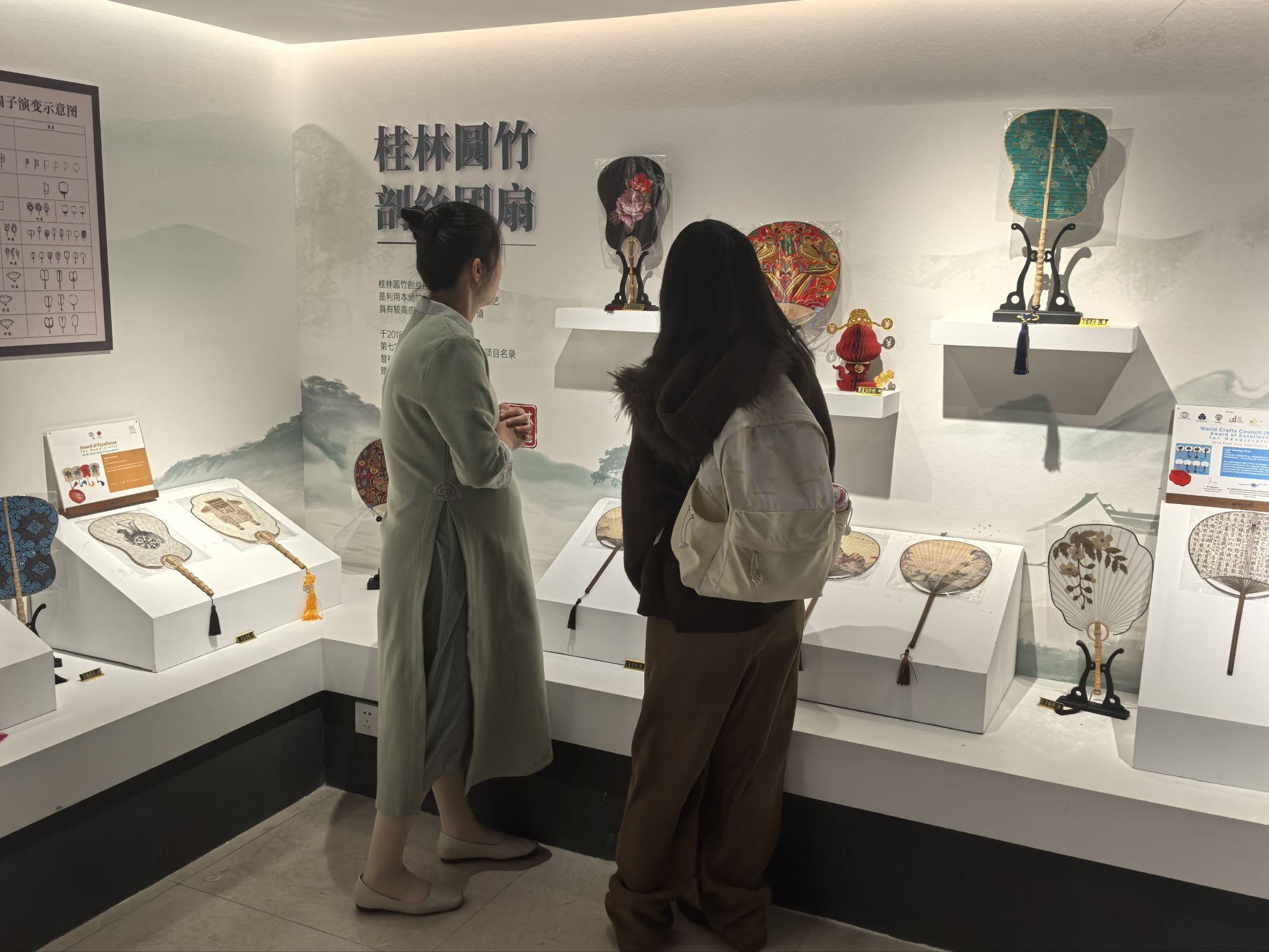 (團隊成員在與館內(nèi)的工作人員了解桂林圓竹剖絲團扇)