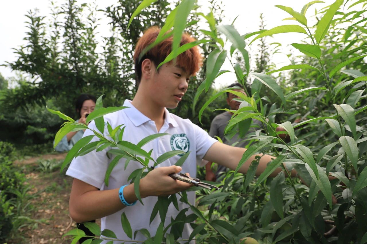 實(shí)踐隊(duì)員們?cè)谶叴蟾绲闹笇?dǎo)下親手為桃樹(shù)進(jìn)行修剪枝葉,培養(yǎng)了學(xué)生的勞動(dòng)精神,是一場(chǎng)生動(dòng)的勞動(dòng)教育實(shí)踐課程。