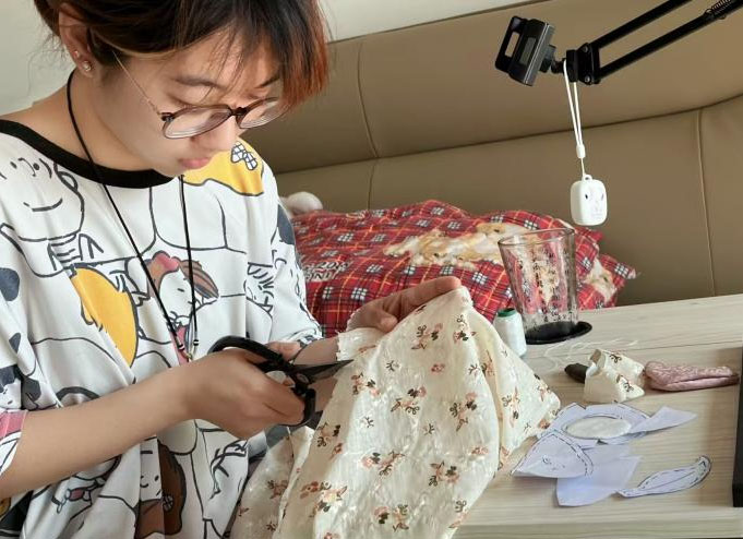 圖為手工藝人對(duì)成員制作的玩偶進(jìn)行縫補(bǔ)