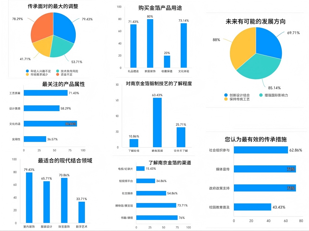 實(shí)踐活動(dòng)伊始,團(tuán)隊(duì)聚焦公眾對(duì)南京金箔的認(rèn)知現(xiàn)狀,精心設(shè)計(jì)涵蓋了解程度與渠道、產(chǎn)品屬性與用途、工藝與傳承、現(xiàn)代結(jié)合與發(fā)展方向以及推廣方式等維度的線上調(diào)查問(wèn)卷,借助社交媒體平臺(tái)、校園社群等多渠道投放,共收集175份有效問(wèn)卷。數(shù)據(jù)顯示,僅10.86%的受訪者對(duì)南京金箔鍛制技藝了解較多,63.43%的人略有耳聞,25.71%的人完全不了解;76%的人通過(guò)書(shū)籍或課程了解金箔文化,54.86%的人通過(guò)社交媒體接觸相關(guān)信息。這一調(diào)研結(jié)果為團(tuán)隊(duì)后續(xù)實(shí)踐活動(dòng)的精準(zhǔn)開(kāi)展提供了科學(xué)依據(jù),也凸顯了加強(qiáng)金箔文化普及的迫切性。