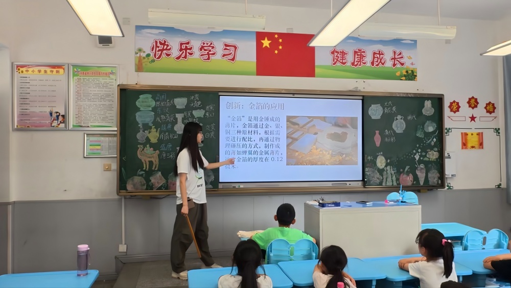 為擴(kuò)大金箔文化的傳播范圍,實(shí)踐團(tuán)還面向河南省的小朋友們開(kāi)展了生動(dòng)有趣的非遺金箔教學(xué)活動(dòng)。團(tuán)隊(duì)成員通過(guò)圖片展示、視頻講解、互動(dòng)問(wèn)答等方式,向孩子們介紹金箔的歷史淵源、制作工藝及文化價(jià)值,在他們心中播下傳承非遺文化的種子。