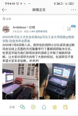 防疫青年志愿者訊:2020年7月8日,河北工業(yè)大學(xué)智能學(xué)院調(diào)研隊伍“防疫青年志愿者隊”通過線上的形式開展了2020暑假調(diào)研的啟動儀式,拉開一次特殊的社會實踐課帷幕。