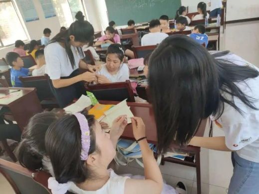 在丁里長街道喬莊村的“小荷學(xué)堂”,大學(xué)生志愿者和孩子們一起做手工