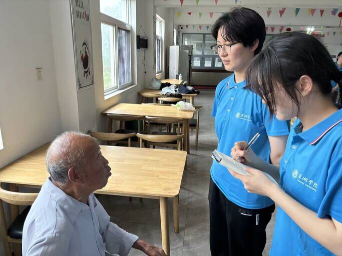 采訪交流 了解情況 到達敬老院后,團隊成員對敬老院負責人管翠紅院長和爺爺奶奶進行了采訪,具體了解敬老院的日常助老服務以及老人們的生活起居狀態(tài)。在與管院長的深入交談中,團隊了解到,周邊地區(qū)的社工會定期開展節(jié)目表演、端午節(jié)包粽子等特色活動來慰問老人。當?shù)蒯t(yī)院也會定期進行體檢等相關(guān)義診服務,如遇緊急情況,能確保第一時間提供救助服務,保障老人們的健康。敬老院還成立了餐飲委員會,嚴格制定并公示每周菜譜,根據(jù)老人們的反饋意見進行調(diào)整。團隊成員侯停停采訪了李爺爺,李爺爺表示自己在敬老院已經(jīng)十年了,對這里的助老服務非常滿意,也非常歡迎大學生志愿者的到來。