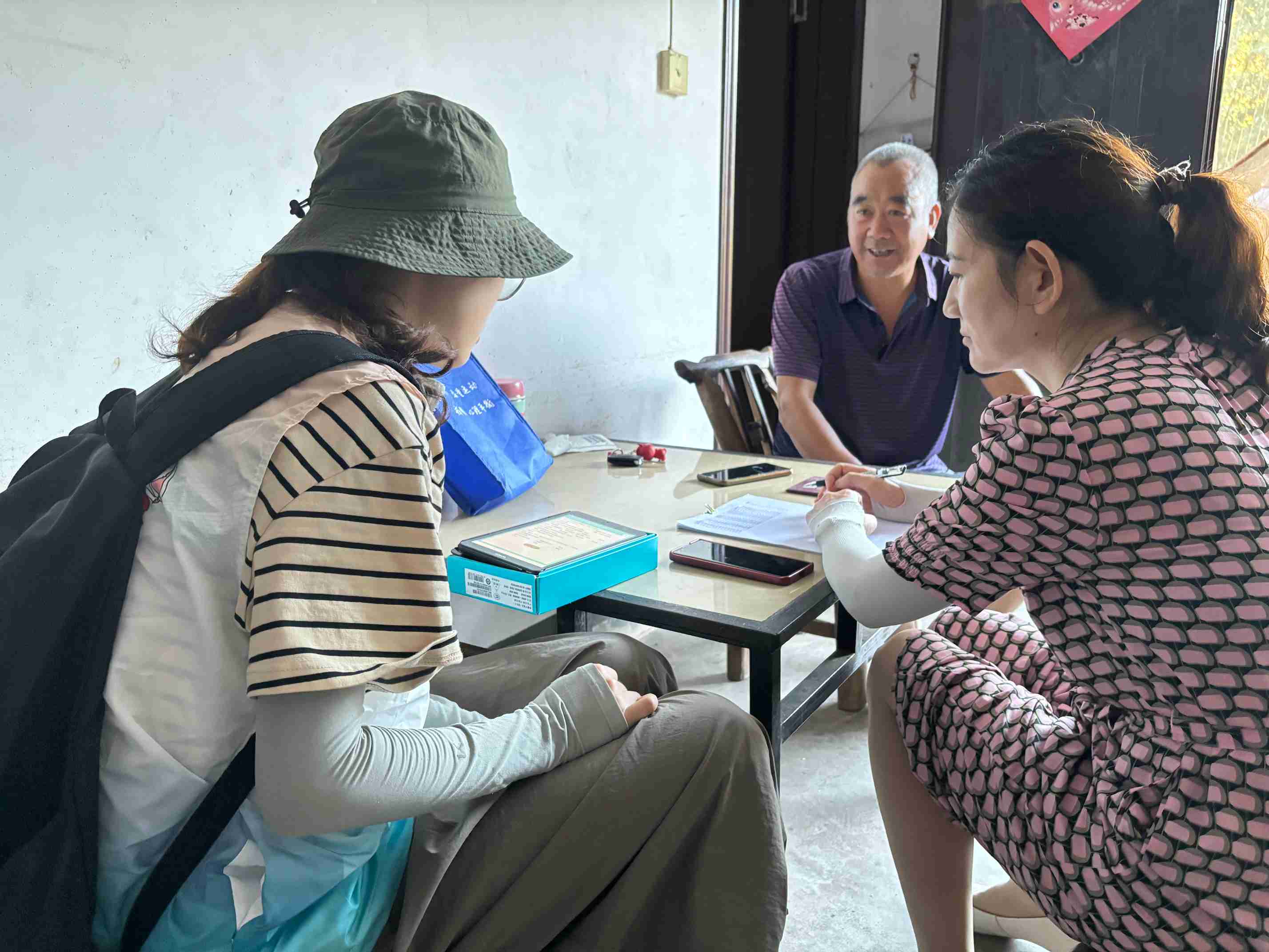 實踐隊共分成兩組深入當?shù)卮迕窦彝,開展走訪調研,記錄詳細的數(shù)據(jù)信息。調研方式是通過衛(wèi)生院提供的全國居民健康素養(yǎng)調查問卷,分析了解當?shù)卮迕竦尼t(yī)療健康知識水平、健康水平和疾病防治意識。其中,已經(jīng)退休了的老村醫(yī)為實踐隊員們提供了大量的幫助,他帶領著實踐隊員們深入走進一戶戶村民當中進行調查,雖然年紀已經(jīng)很大了,但是他不辭辛苦地時刻關心著村民們的健康狀況,也為實踐隊員們的調研做出了很大貢獻。在調研中,隊員與村民們親切交流,詳細詢問家庭的收入情況、家庭成員的健康狀況、就醫(yī)情況以及對醫(yī)療服務的需求和建議、以及村民們的心理健康狀況等等。村民熱情回應并積極參與問卷調查,有的村民更是拿出自己家種的桃子給實踐隊員們,并且也主動的詢問相關疾病的護理以及康復方法,實踐隊也給予了村民滿意的答復。