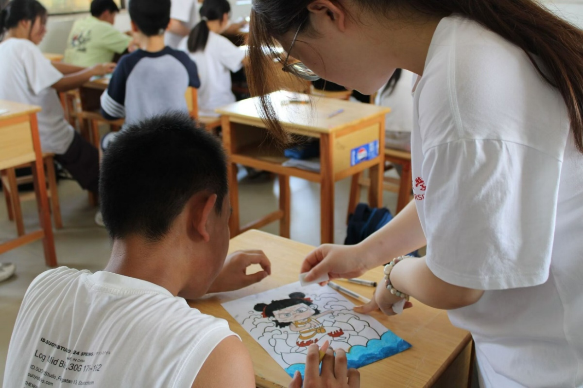 圖為教學組成員教學生涂色。葉子軒 供圖