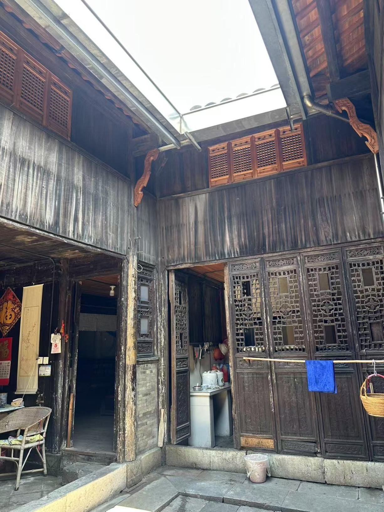 有斐堂由徽州歙縣籍商人吳基永于1884年耗費三年多時間精心建造,為三進(jìn)三開間的二層跑馬樓建筑,占地367.35平方米,磚木結(jié)構(gòu)搭配穿斗式梁架(圖四),硬山屋頂古樸大氣。步入其中,門樓的疊澀設(shè)計與門楣上方精美的戲曲磚雕相映成趣,前堂隔扇、窗欄處浮雕的如意、四季花卉等圖案栩栩如生,額枋、雀替上的如意云頭浮雕細(xì)膩逼真,每一處細(xì)節(jié)都彰顯著清代工匠的高超技藝。這座古宅是建筑藝術(shù)的瑰寶。