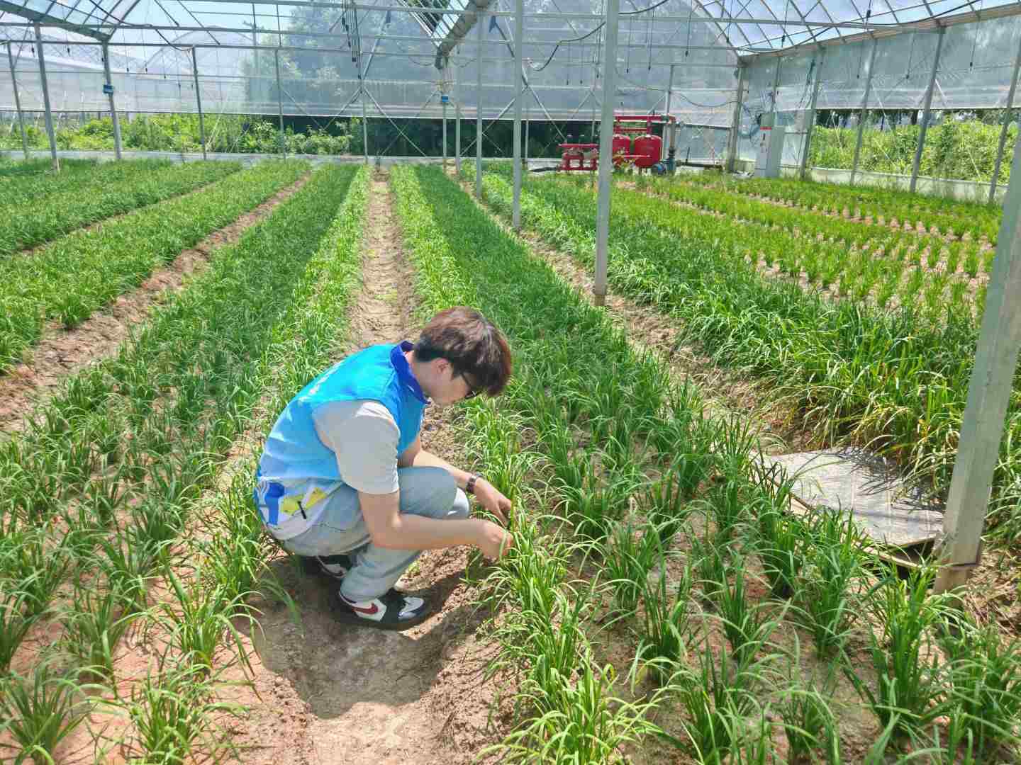 離開葡萄園后,調(diào)研團(tuán)步入總面積達(dá)500畝的紫荊村蔬菜種植基地,標(biāo)準(zhǔn)化連棟大棚整齊排列,棚內(nèi)韭菜、豆角、小白菜等時令蔬菜長勢喜人,五彩菜地和水鄉(xiāng)農(nóng)舍相映成趣,景美如畫。基地負(fù)責(zé)人介紹,作為合肥市重要的保供基地之一,紫荊村依托智慧農(nóng)業(yè)技術(shù)構(gòu)建起全鏈條數(shù)字化管理體系,實(shí)現(xiàn)蔬菜從播種到采收的全周期精準(zhǔn)管控。