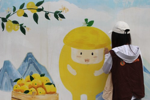一進入陳家灣村,巨幅墻繪《秭歸橙史》沿路鋪展,金黃的臍橙簇擁著峽江碧水,與屈原《橘頌》中“后皇嘉樹”的千年意象遙相呼應(yīng)。最引人注目的當(dāng)屬村里的“臍橙IP形象”——圓潤可愛的橙子娃娃,或捧著果實歡笑,或與村民一同勞作,成為村莊的“形象大使”。這些墻繪并非單向創(chuàng)作,而是村民與大學(xué)生共同執(zhí)筆的成果。從設(shè)計到填色,再到“我家橙樹”手印互動墻,藝術(shù)成了凝聚鄉(xiāng)情的紐帶。