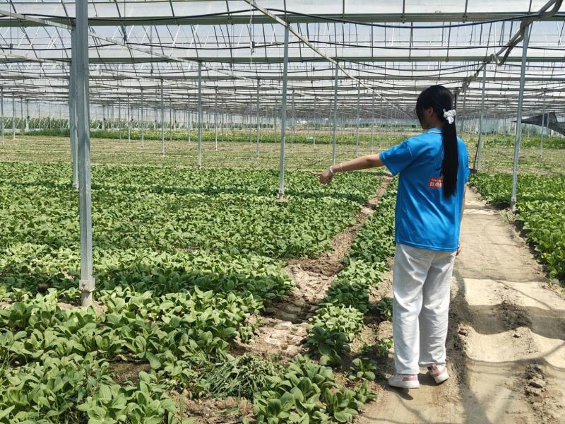 圖為調(diào)研團(tuán)成員參觀蔬菜種植基地的小青菜。陳婧供圖