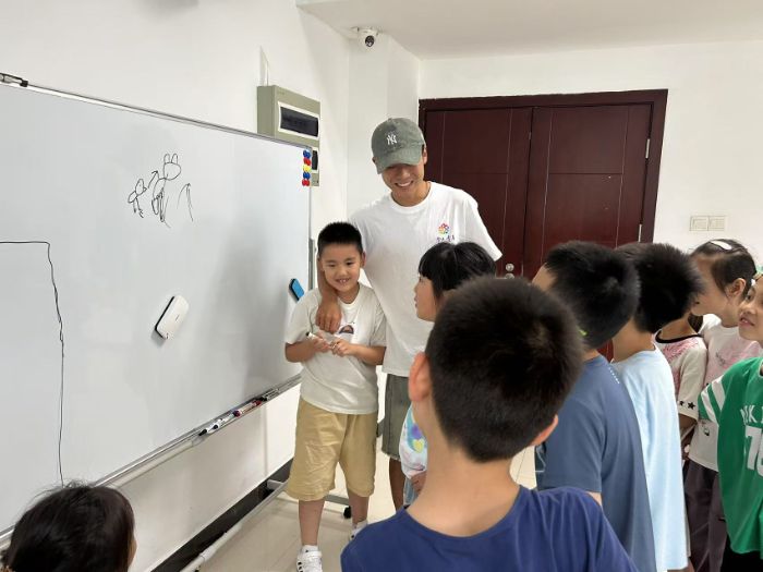 下午14時,托管班活動室里早已布置成歡樂的海洋。四組孩子排列成隊,目光緊緊盯著志愿者手中的詞卡。"三長兩短""雞飛狗跳""滿地找牙"等充滿趣味的成語,以及"兔子""牛"等生動的動物詞匯,在志愿者的引導下成為激發(fā)孩子們創(chuàng)造力的鑰匙。當"雞飛狗跳"的詞卡出現(xiàn)時,畫畫的成員迅速在白板上勾勒出振翅的小雞和往上跳躍的小狗,隊友們立刻心領神會地喊出答案,現(xiàn)場爆發(fā)出陣陣掌聲。