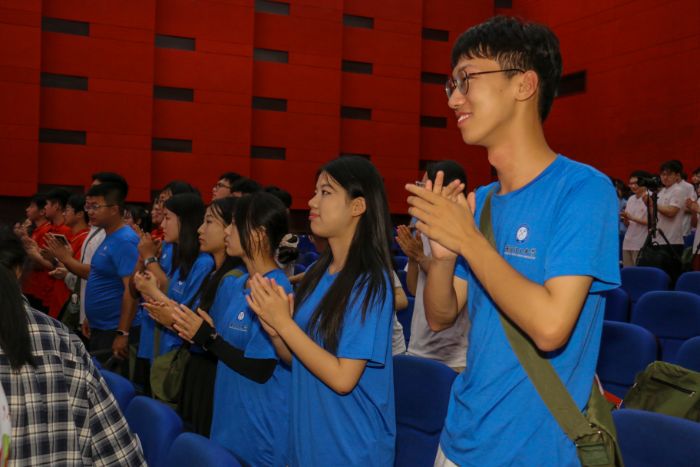 學習了井岡山精神的深刻內(nèi)涵之后,同學們(著藍色隊服)起立鼓掌。王智杰 攝