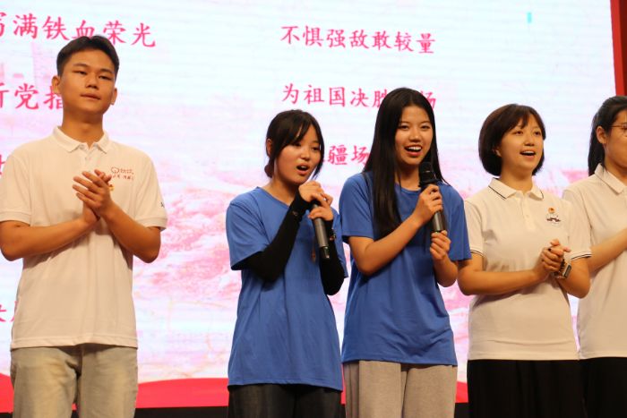 安理工實踐團隊隊員(著藍色隊服)演唱紅歌《強軍戰(zhàn)歌》。王智杰 攝