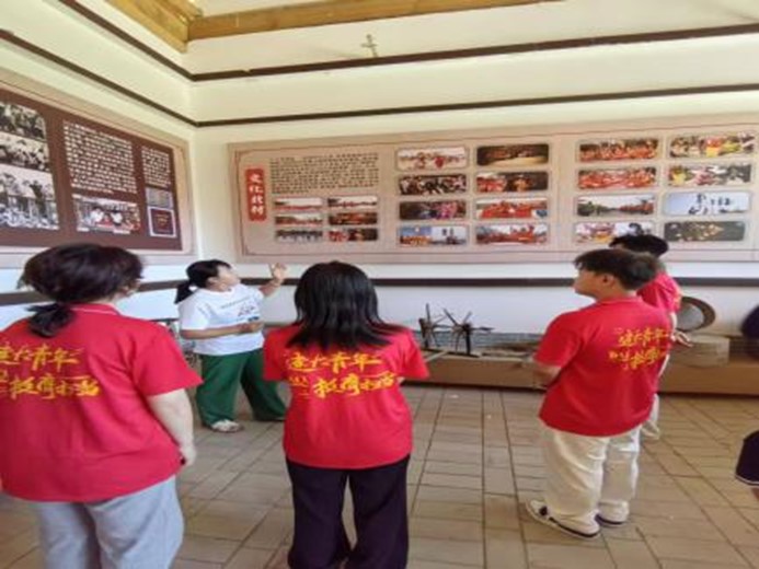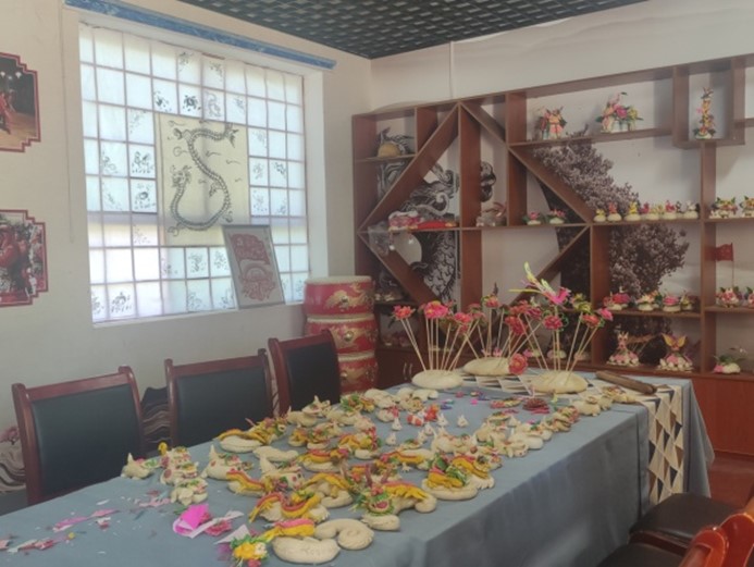 上午 11 時,實踐團成員又奔赴阿黨鎮(zhèn)北村。北村擁有著源遠流長、豐富深厚的歷史文化底蘊,這里甚至還有著全省首家村級文聯(lián)。在北村干部以及霸王鞭傳承人李小亞的引領下,實踐團成員興致勃勃地參觀了北村村史館以及北村抬鼓傳習所。北村的抬鼓、面花、剪紙、霸王鞭、社火等傳統(tǒng)民間藝術聲名遠揚,在周邊地區(qū)廣受贊譽。群眾對于這些傳統(tǒng)藝術的傳承和學習熱情高漲,蔚然成風。特別是那獨具特色的抬鼓,已然成為黃陵文化的重要象征,以及黃帝陵祭典中一張亮麗奪目的名片。