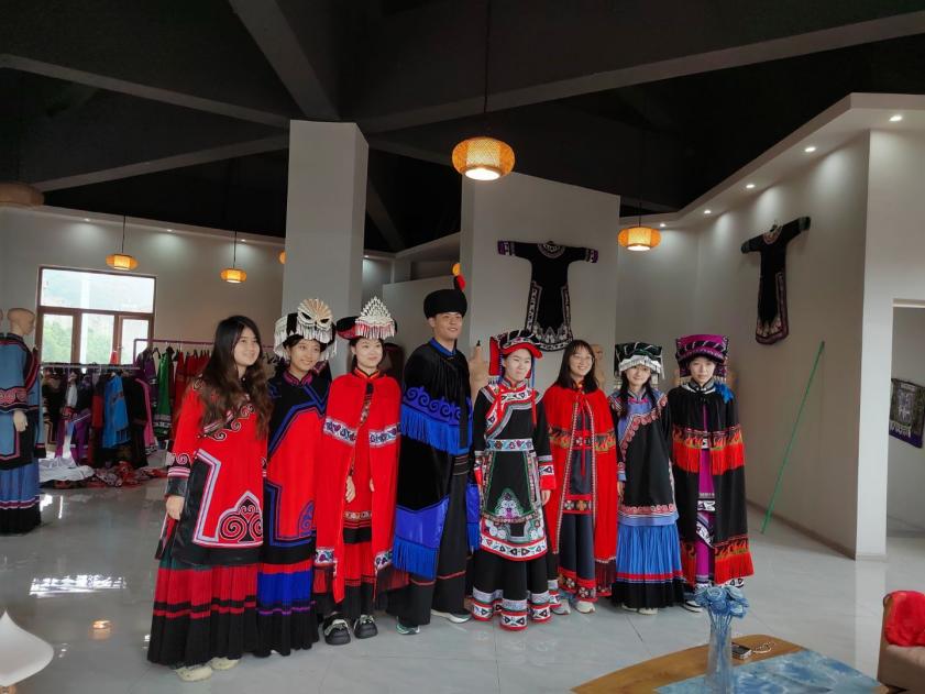 今日依舊是陰雨天,朦朧的霧氣柔軟地環(huán)抱住近處的青山。這樣的天氣與景色,在夏季,在我那位于海濱的家鄉(xiāng)煙臺,是極少出現(xiàn)的。當然,這里別樣的不只是風景,還有人情。今日,我們支教隊便前往了赫章當?shù)氐囊妥宸椢幕^,一覽少數(shù)民族別具一格的服飾之美。