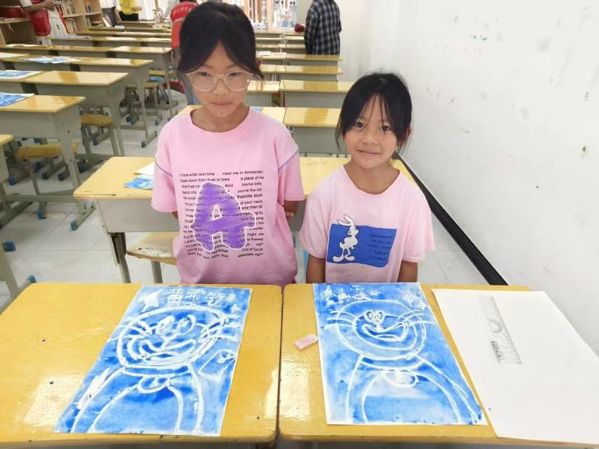 中午的陽光變得熱烈,創(chuàng)意的種子則在葉子嘉老師的美術(shù)課上萌芽。子嘉老師帶著孩子們玩起了“水油分離”的魔法。油畫棒在紙上留下五彩斑斕的秘密,再刷上一層厚厚的水粉,那些圖案便如同沖破迷霧般清晰地浮現(xiàn)出來。孩子們的驚嘆聲此起彼伏,他們手中的畫筆仿佛有了魔力,畫出了星空、海洋,還有自己心中最斑斕的夢。看著那些充滿想象力的畫作,我仿佛看到了他們無限可能的未來。而在劉春輝老師的音樂課上,飄來了《如愿》的旋律。“而我將愛你所愛的人間,愿你所愿的笑顏”,這首歌的歌詞,在此情此景下顯得格外動人。孩子們的歌聲或許還帶著稚嫩的跑調(diào),但那份清澈與認真,卻足以穿透人心。他們唱著“山河無恙,煙火尋常”,仿佛在回應著上午影片里的那些身影,也唱出了自己對未來的期盼。