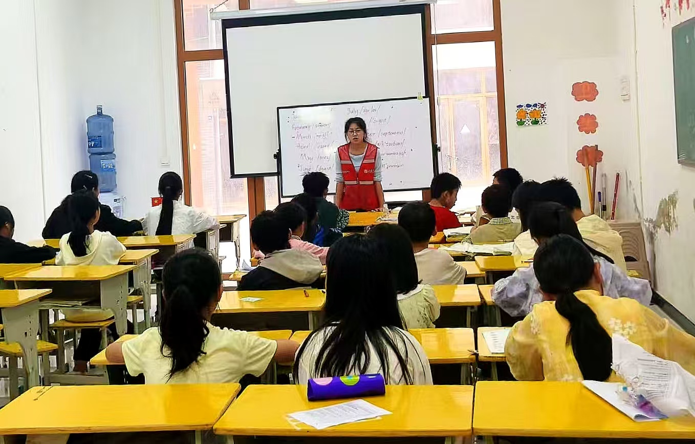 接下來(lái)我旁聽(tīng)了王詩(shī)涵老師的英語(yǔ)課,內(nèi)容主要為時(shí)間類的詞匯和知識(shí)。老師在黑板上寫(xiě)下了月份、星期等詞匯,悉心地帶著孩子們一起拼讀,孩子們跟著老師一起讀單詞,聲音此起彼伏。當(dāng)孩子們有發(fā)音不標(biāo)準(zhǔn)時(shí),老師不急不躁,彎下腰一個(gè)個(gè)糾正口型,陽(yáng)光透過(guò)雨云的縫隙落在她肩頭,和孩子們仰起的笑臉相映,暖融融的。