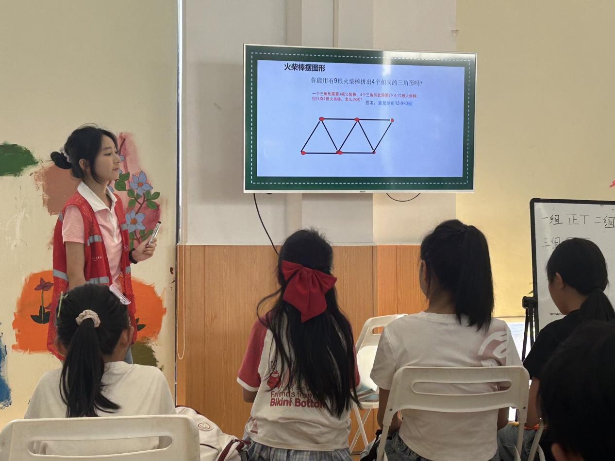 “助力黔行”志愿服務隊成員 楊雅茹7月18日 星期六 雨夏雨淅瀝,敲打著金銀山少兒活動中心的玻璃窗,蜿蜒的水痕模糊了窗外的景象。室內(nèi),柔和的燈光驅(qū)散了雨天的陰沉,均勻地灑在課桌上,映照著一張張稚嫩而充滿期待的小臉。懷揣著準備好的課件和一束色彩繽紛的火柴棒,我心中鼓動著熱切的期盼——今天,我要為這里的孩子們帶來一堂數(shù)學趣味課,祈盼能在他們心田悄然播撒下好奇與探索的種子。