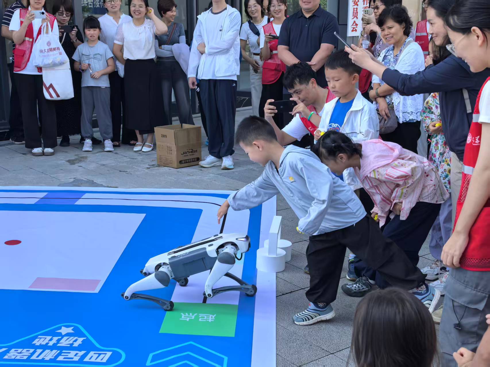 儀式現(xiàn)場,一只由山東大學(xué)自主制造的四足機器人成為了“明星”。在操作員的嫻熟操控下,這只“機器狗”靈活地完成了打招呼、跳躍、后空翻等一系列高難度動作,引得在場眾人紛紛駐足圍觀、拍照留念。孩子們更是按捺不住好奇心,小心翼翼地靠近與它互動,這讓孩子們近距離感受到了科技的魅力。