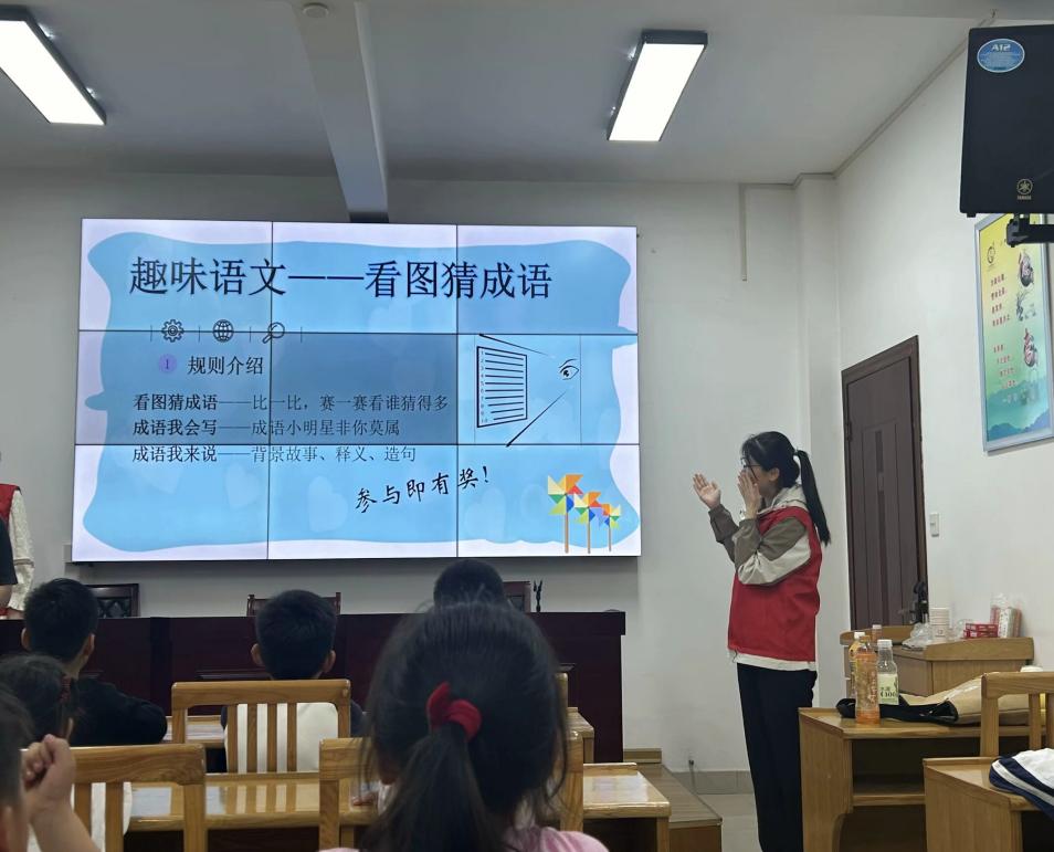 緊接著在完成了小游戲的熱身后,團(tuán)隊(duì)成員王礫雪和程玲給小朋友們帶來(lái)了趣味語(yǔ)文,看圖猜成語(yǔ)的活動(dòng);顒(dòng)中,她們精心準(zhǔn)備了一系列有趣的圖片,每張圖片都蘊(yùn)含著一個(gè)經(jīng)典的成語(yǔ),如胸有成竹,狡兔三窟,對(duì)牛彈琴。