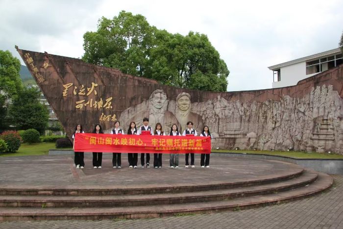 (圖為服務隊成員開展暑期“三下鄉(xiāng)”出征儀式) 參觀交流:追溯紅色足跡,感悟初心使命實踐團隊在指導老師的帶領下,首站深入古田會議會址及紀念館,開啟紅色志愿服務之旅。在古田會議舊址前,團員青年們在團旗下莊嚴宣誓,重溫入團誓詞,錚錚誓言回蕩在古厝上空,與革命先輩“思想建黨、政治建軍”的初心形成跨越時空的對話,這不僅是對歷史的回望,更是對愛國初心的堅守。