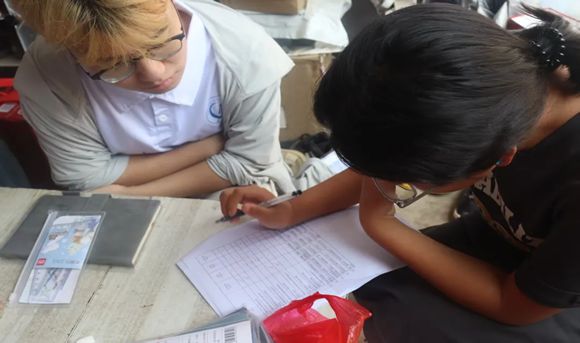 圖為心協(xié)成員詢問女孩心理健康情況。秦夢(mèng)茹攝